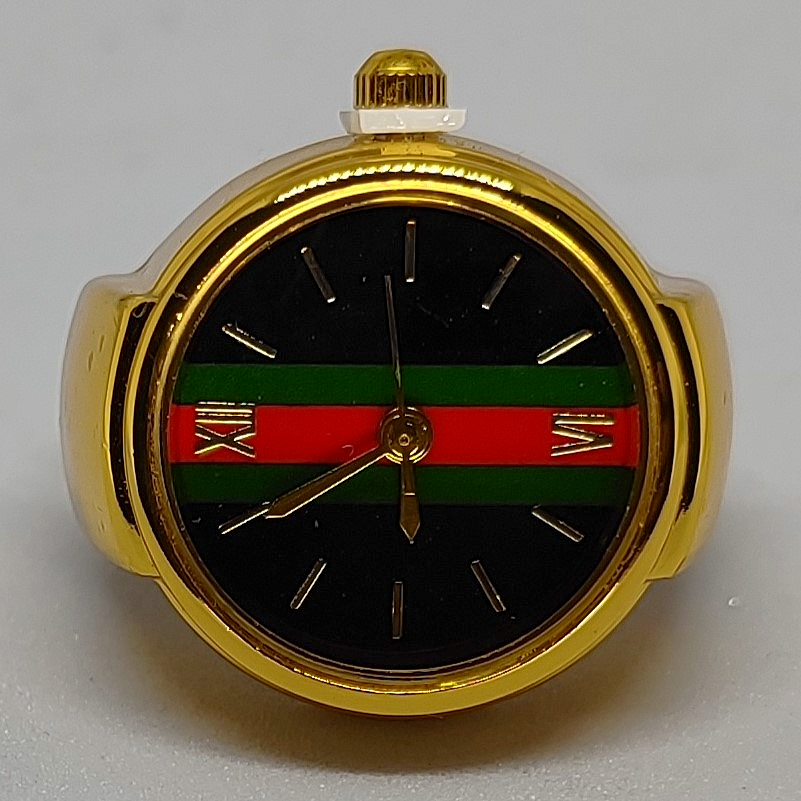 Where fashion meets function, this black dial ring watch makes a statement that’s both timeless and daring. Featuring a Vertical red and green stripe across the dial—evoking luxury and edge—it’s framed in a gold-toned bezel and accented with Roman numerals XII and VI for a classic touch.